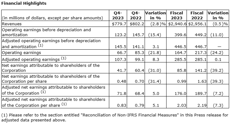 Revenues decreased by $15.5-million, or 0.5 per cent, from $2,956.1-million in fiscal 2022 to $2,940.6-million in the corresponding period of 2023. This decrease is mainly explained by the organic decline largely caused by lower volume, partially mitigated by the favourable exchange rate effect, the net impact of price increases due to the current inflationary situation and the acquisitions.