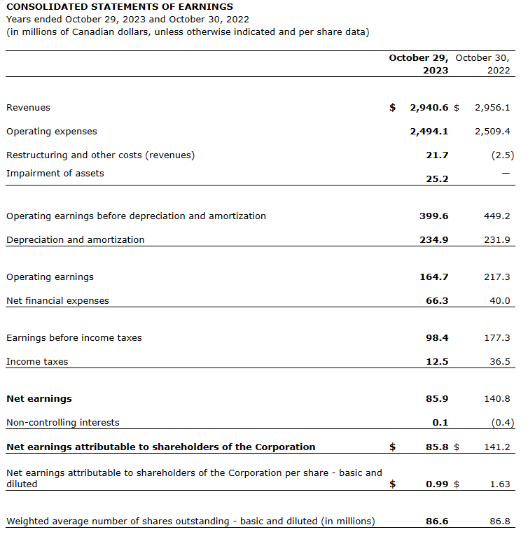 Net earnings attributable to shareholders of the corporation decreased by $55.4-million, or 39.2 per cent, from $141.2-million in fiscal 2022 to $85.8-million in the corresponding period of 2023. This decrease is mainly due to asset impairment charges as well as the increase in restructuring and other costs, depreciation and amortization, and financial expenses, partially mitigated by lower income taxes. On a per-share basis, net earnings attributable to shareholders of the corporation went from $1.63 to 99 cents, respectively.