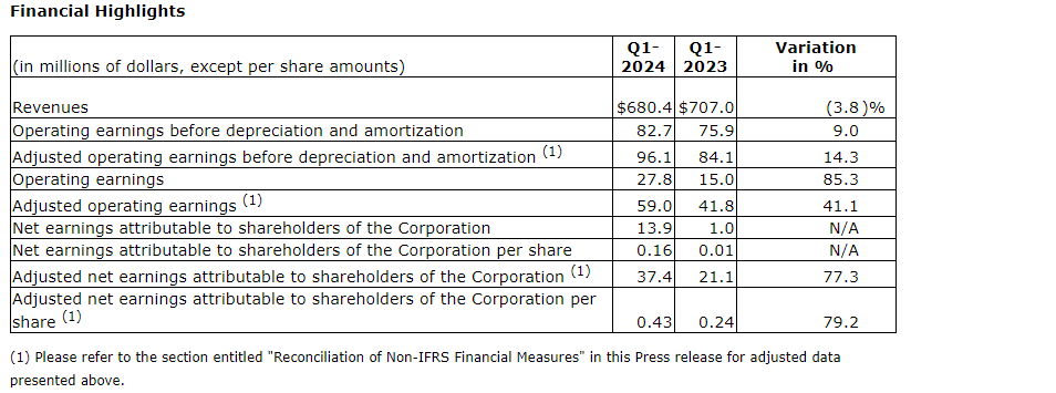 Adjusted net earnings attributable to shareholders of the corporation increased by $16.3-million, or 77.3 per cent, from $21.1-million in the first quarter of 2023 to $37.4-million in the first quarter of 2024. This increase is mainly attributable to the previously explained increase in adjusted operating earnings before depreciation and amortization and the decrease in depreciation and amortization and financial expenses, partially offset by higher income taxes. On a per-share basis, adjusted net earnings attributable to shareholders of the corporation went from 24 cents to 43 cents, respectively.