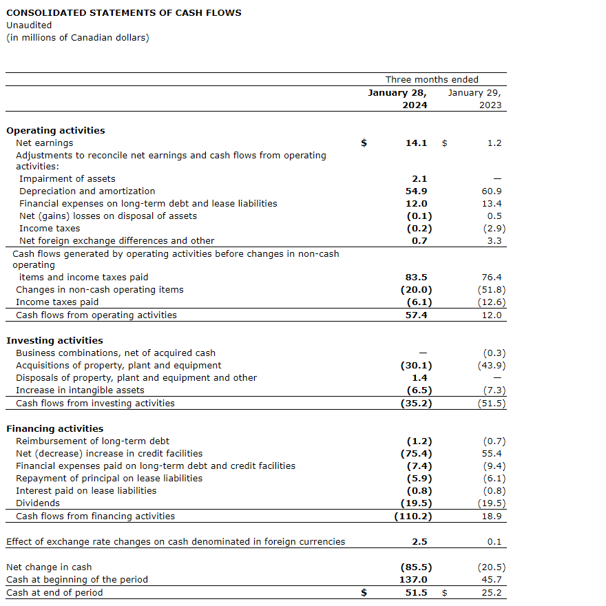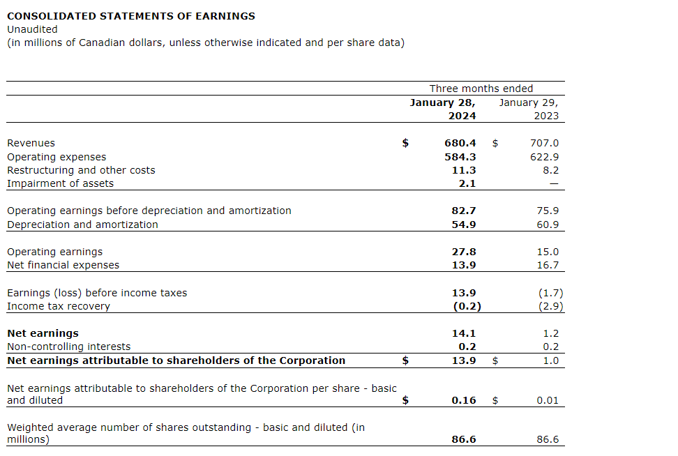 Revenues of $680.4-million for the quarter ended Jan. 28, 2024; operating earnings of $27.8-million; and net earnings attributable to shareholders of the corporation of $13.9-million (16 cents per share).