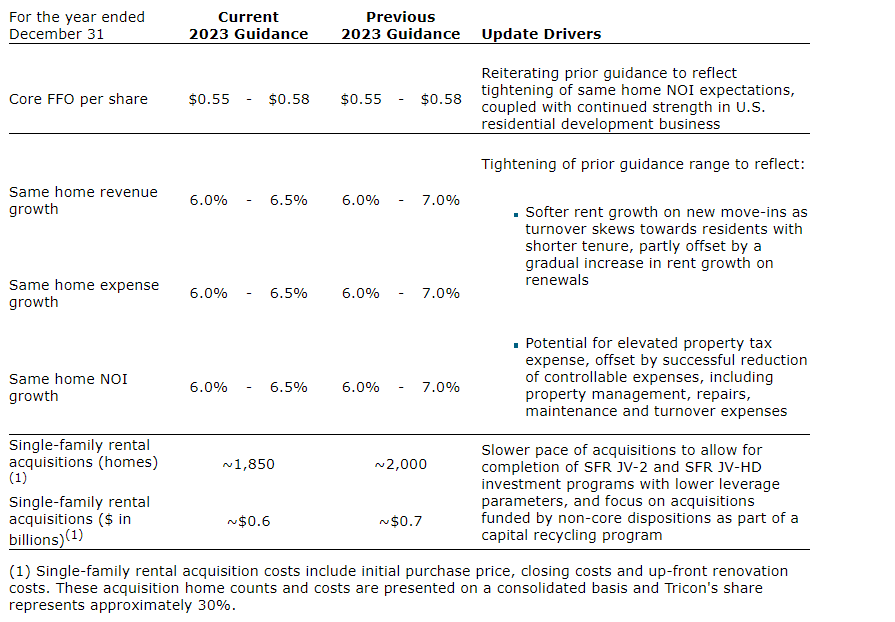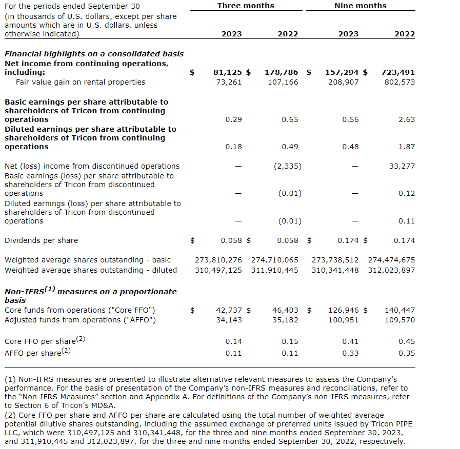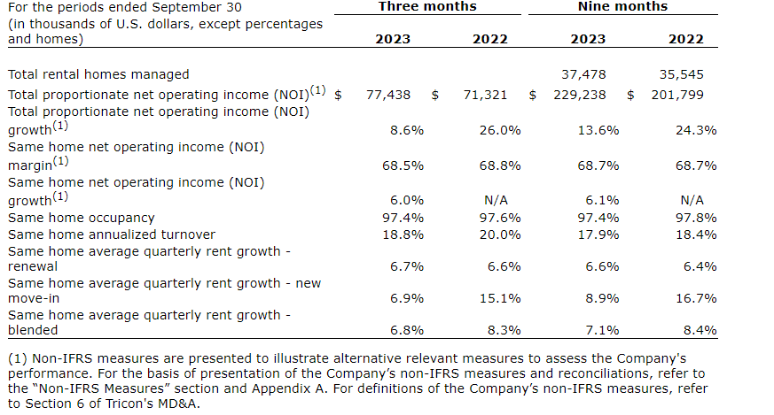 Tricon Residential Inc. has released its consolidated financial results for the three and nine months ended Sept. 30, 2023.