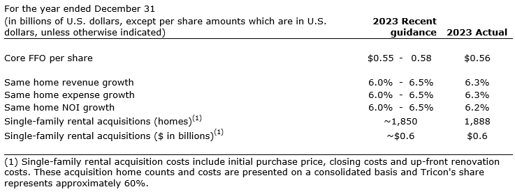 The attached guidance table shows the most recent guidance and actual results for the company's core FFO per share, same home metrics and acquisitions for the year ended Dec. 31, 2023. Tricon achieved core FFO per share and same home results that were near the midpoint of guidance, and slightly exceeded its acquisitions guidance for the year.