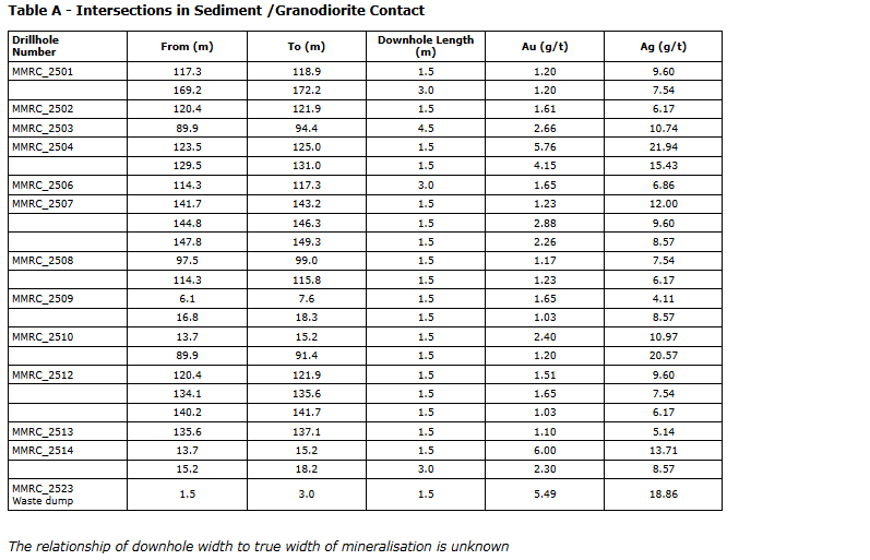 - Focused on sampling and assaying of the granodiorite/sediment contact with drill results up to 1.5 metres at 6.0 grams per tonne Au (gold) and 13.71 g/t Ag (silver) in hole MMRC_2514. The complete set of drill hole assays is shown in Table A.
