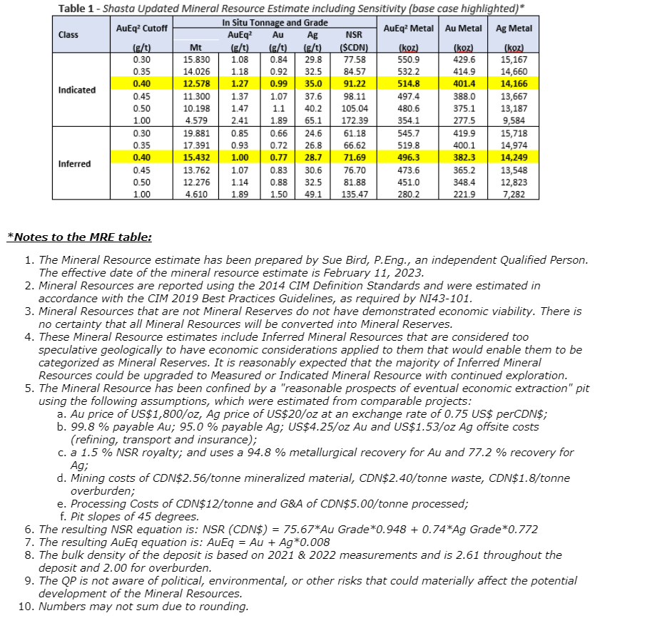 - Shasta deposit remains open at depth and along strike (see TDG news release dated March 20, 2023);