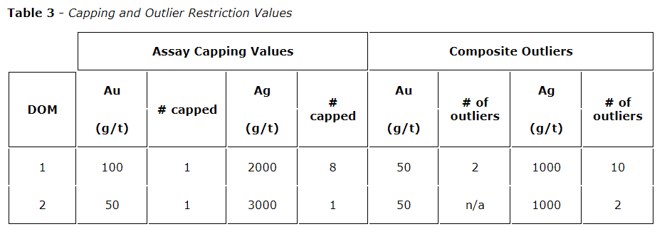 Variography was completed on each domain for Au and Ag to determine appropriate search parameters. Interpolation has been done by ID3 in four passes with increasing search distances up to 150 m for the major and minor axes. The modelled grades have been validated using declustered composites (nearest neighbour or polygonal model) and indicate no global bias with appropriate smoothing throughout the grade-tonnage curves.
