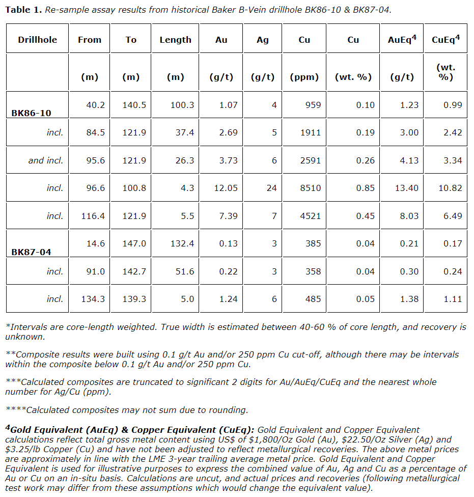 Reassay of the historical intersection of the B-vein confirmed the Au-Ag grades (see results comparison section below) and widths historically reported. Both drill holes continued to support the concept that the Baker B-vein is surrounded by a lower-grade halo of Cu-Au mineralization, and the Cu mineralization is likely a function of metal scavenging from a larger porphyry system at depth.