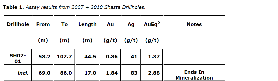 - SH07-04 (Shasta) -- 65.0 m grading 0.64 g/t Au and 18 g/t Ag (0.87 g/t AuEq) from 78.0 m depth: