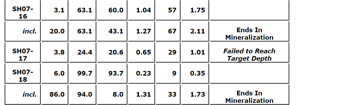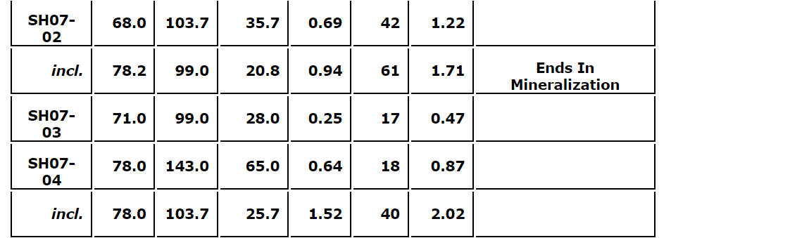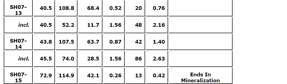 - SH07-14 (Creek) -- 63.7 m grading 0.87 g/t Au and 42 g/t Ag (1.40 g/t AuEq) from 43.8 m depth: