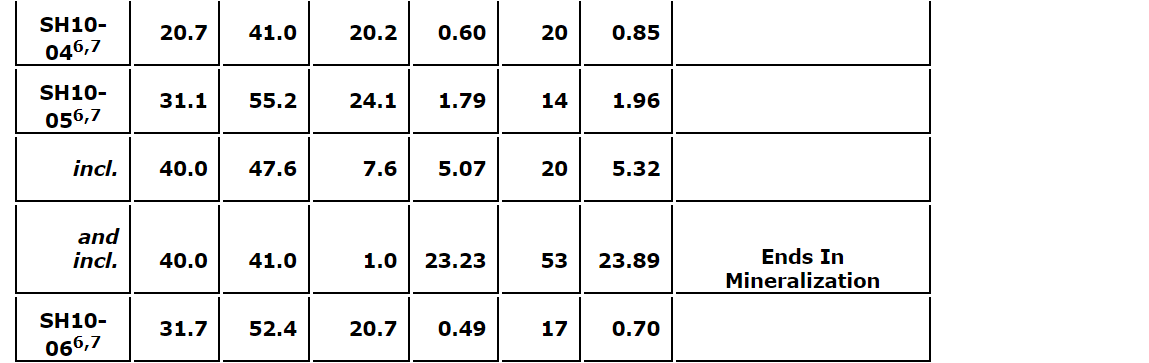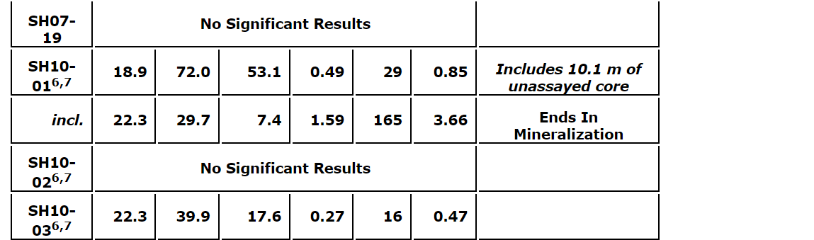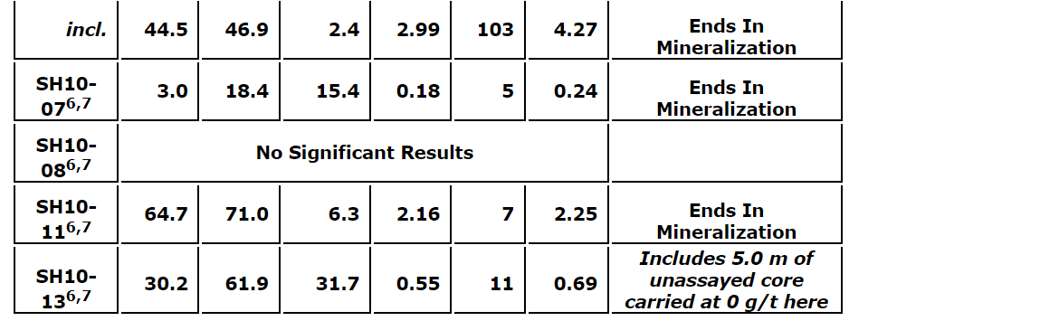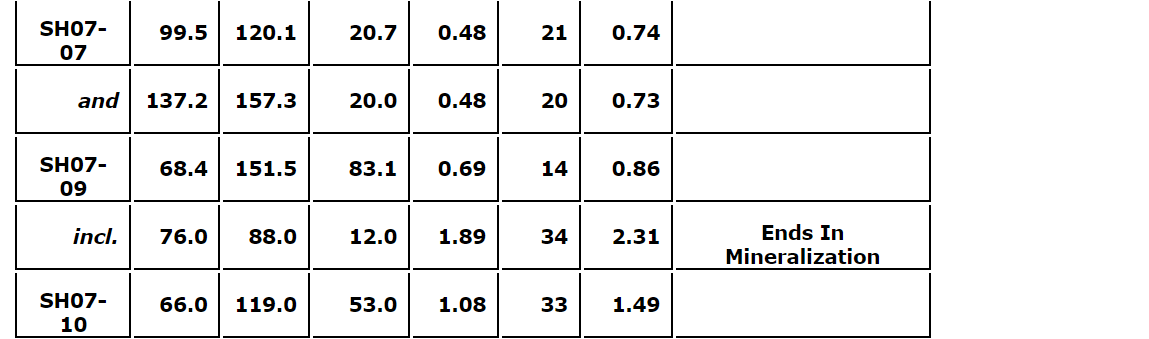 - SH07-10 (Creek) -- 53.0 m grading 1.08 g/t Au and 33 g/t Ag (1.49 g/t AuEq) from 66.0 m depth: