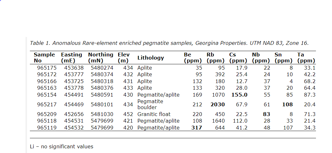 As of Aug. 2, 2023, a total of 230 grab sample assays have been completed and returned by Actlabs, Ancaster, Ont., throughout the Georgina Stairs and Georgina East properties from the 2023 summer mapping program. Additional samples have assays pending. These grab samples cover all of the lithologies present on the properties: granite, pegmatite, metasedimentary rocks and diabase. This assay database contains samples with anomalous rare elements (Be, Rb, Cs, Nb, Sn, Ta), which are associated with lithium mineralization.