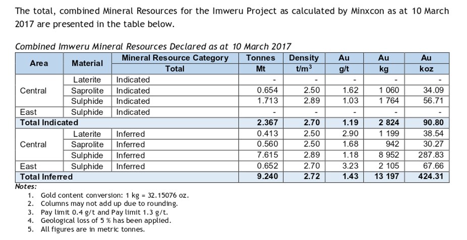 The Project (PL11953/2022 of 19km2) borders the Imwelo Mining License to the west, east and south. The Company announced the proposed acquisition of the Imwelo Mining License in its press release dated August 10, 2023. Exploration drilling by previous operators has identified a historical resource estimate containing indicated mineral resources of 90,800oz Au at a grade of 1.19 g/t and an inferred mineral resources of 424,310oz Au gold at a grade of 1.43 g/t, located in two zones (the "Historical Resource Estimate"). A number of targets remain to be tested. The Historical Resource Estimate is derived from a report entitled "Independent Competent Person's Report on the Imwelu Gold Project, Tanzania - Mineral Resource Report" dated March 10, 2017 (the "Report") prepared by Minxcon (Pty) Ltd of South Africa. The Historical Resource Estimate presented in the Report was carried out in accordance with the "Australasian Code for Reporting of Exploration Results, Mineral Resources and Ore Reserves" (2012 Edition) prepared by the Joint Ore Reserves Committee of the Australasian Institute of Mining and Metallurgy, Australian Institute of Geoscientists and Minerals Council of Australia. The Historical Resource Estimate was based on a preliminary economic assessment completed in 2014 on the Project, which utilised a cut-off grade of 0.4 g/t, for an open pit scenario. A gold price of USD$1,469/oz, and a 90% plant recovery factor were applied in the calculation of the cut-off, with a 0% dilution factor. The Report includes the following Historical Resource Estimate: