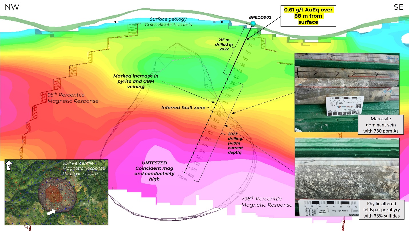 The Company is testing a 650 m wide conductivity high at the centre of an anomalously magnetic volume of rock, 1.2 km in diameter, where potassic altered porphyritic andesites overprinted by chlorite are found below a gold-bearing skarn (Figure 1). Here, the electrically resistive unit returned 88.0 m of 0.61 g/t AuEq from surface (see Company news release dated 24th of January 2023). The redrilled Phase I drill hole has now been extended beyond its 2022 terminal depth of 215 m along the same dip and azimuth. The HQ diameter diamond drill bit has now reached 468 m as it progresses at a rate of ca. 20 m daily to intercept the >60 mS/m conductor in a week.