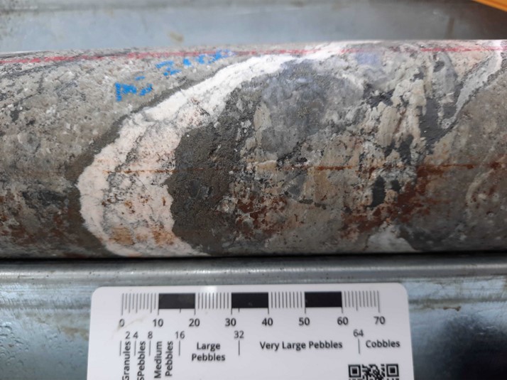 At depth of 320 m and spatially coincident with a sub-horizontal conductivity change drilling has penetrated an intensely silicified structure underneath which there is a substantial increase in the volume of sulfide minerals and density of carbonate base metal veins (Figure 2). This structure, interpreted as a low-angle reverse fault, appears to intersect surface toward NW around the same area where gossanous material was previously mapped. It is suggested that this zone could be a target for intersection of carbonate-hosted, base metal veining.