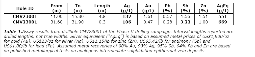 Drill hole CMV23001 intersected 551 grams per tonne silver equivalent over 4.8 metres from 11 m down hole with a further mineralized interval of 669 g/t AgEq over 0.3 m from 31.60 m;