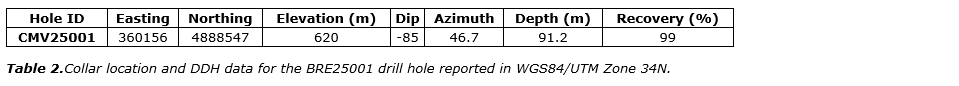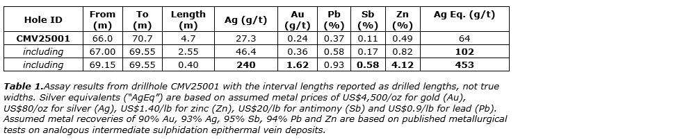• Drill hole CMV25001 intersected 102 grams per tonne (g/t) silver equivalent (AgEq) over 2.55 metres (m) within a broader zone of 64 g/t AgEq over 4.7 m from 66 m (see table 1) and including 0.4 m wide epithermal mineralized zone with 453 g/t AgEq over 0.4 m;
