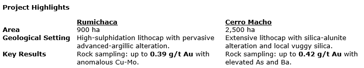 Both properties show alteration and geochemical signatures typical of the upper levels of large, high-sulphidation epithermal and porphyry systems. The company's initial goal is to define chargeability/resistivity anomalies and drill targets beneath shallow cover.