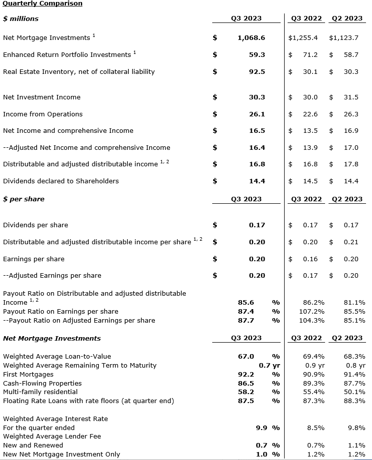 At the end of the period, net mortgage investments were $1,068.6-million (versus $1,255.4-million at Q3 2022) bearing a weighted-average interest rate of 9.9 per cent (versus 8.5 per cent at Q3 2022 and 9.8 per cent at second quarter 2023) and a weighted-average LTV of 67.0 per cent (versus 69.4 per cent at Q3 2022 and 68.3 per cent at Q2 2023); the company also had net real estate inventory of $92.5-million at Q3 2023, versus $30.1-million at Q3 2022;