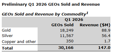 "Triple Flag is off to a record start and we are firmly on track to deliver on our 2026 GEOs guidance of 95,000 to 105,000 ounces," commented Sheldon Vanderkooy, chief executive officer. "Our diversified portfolio achieved key organic growth milestones during the quarter, including a PFS [prefeasibility study] for Arthur in Nevada, a PEA [preliminary economic assessment] for Kemess in B.C. and an updated PEA for Gunnison in Arizona. We look forward to an upcoming positive construction decision at Hope Bay expected in May, 2026, and continued to advance our active deal pipeline, supported by a strong balance sheet with over $1-billion of available liquidity."
