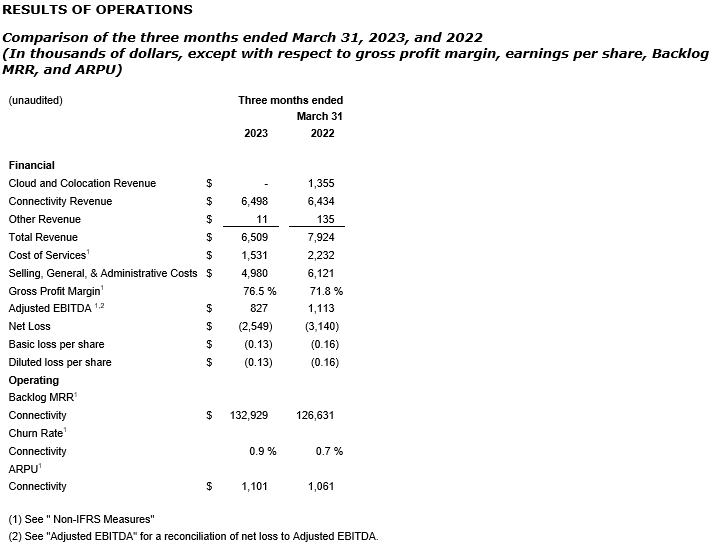 Connectivity revenues increased 3.2 per cent from fourth quarter 2022 and 1.6 per cent from the same quarter in the prior-year period, with connectivity revenue totalling $6.5-million for the three months ended March 31, 2023, compared with $6.3-million in Q4 2022 and $6.4-million in the same quarter in the prior-year period. Total revenue decreased 17.7 per cent to $6.5-million for the three months ended March 31, 2023, compared with $7.9-million for the same period in 2022. The decrease in revenue is the result of the Q1 2022 divestiture (1). The Q1 2022 period includes $1.4-million of divested cloud and co-location revenue.