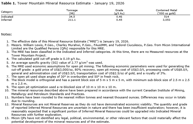 On Jan. 26, 2026, the company announced a mineral resource estimate for Tower Mountain as summarized in Table 1. The estimate was prepared by Micon International Ltd., Toronto, Ont., Canada, an independent engineering firm specializing in mineral resource and reserve estimation for a global client pool.