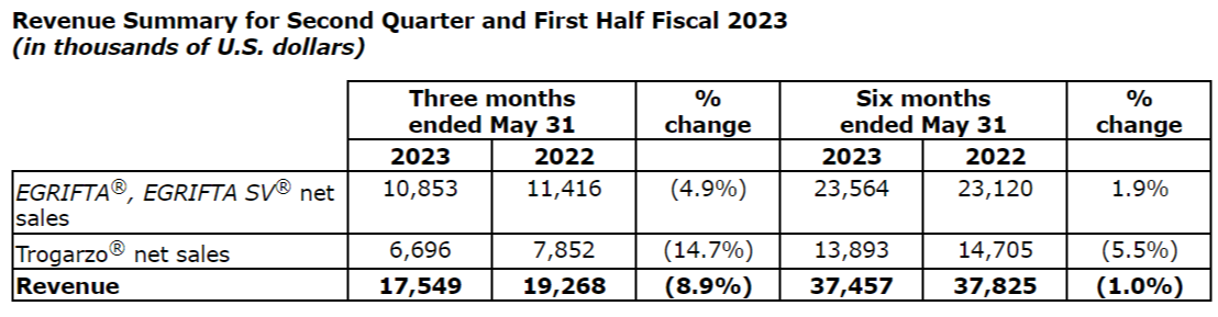 were $10,853,000 compared to $11,416,000 in the second quarter of fiscal 2022, representing a decrease of 4.9% year-over-year. Lower sales of EGRIFTA SV
