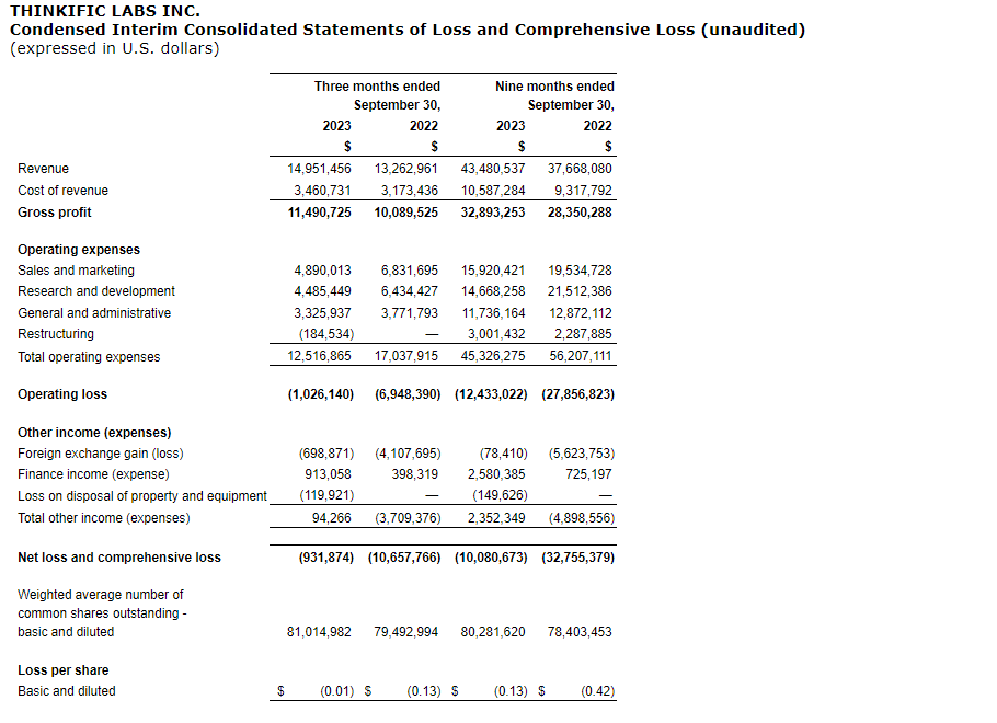 Thinkific Labs Inc. today released its financial results for the quarter ended Sept. 30, 2023.