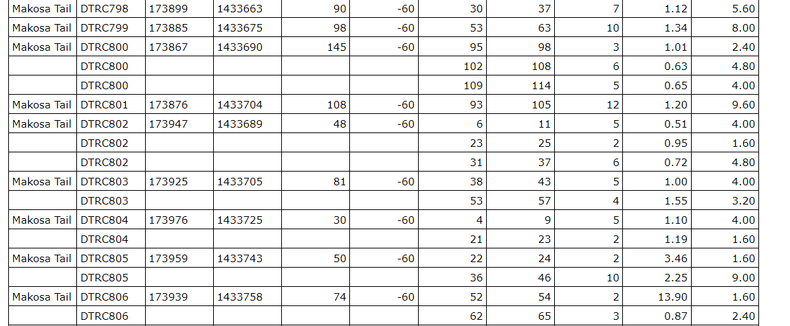 - Makosa Tail (drill hole DTRC807) -- three metres at 23.35 g/t Au from 78 m;