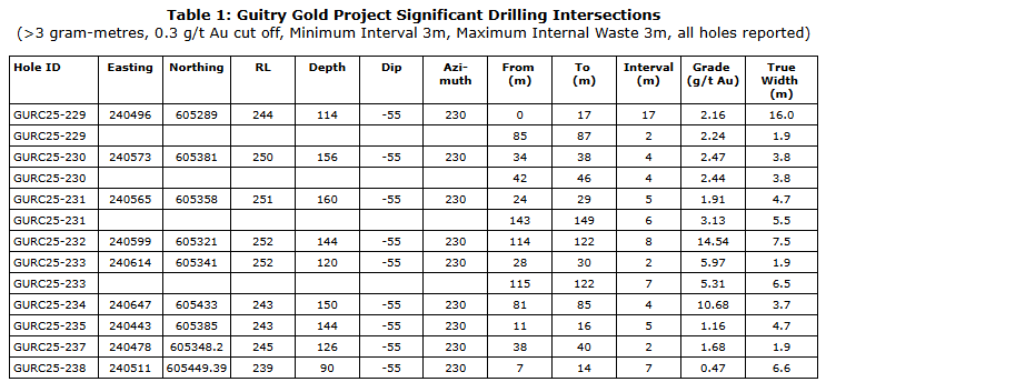 - Drill hole GURC25-232 -- eight metres at 14.54 grams per tonne (g/t) of gold (Au) from 114 m;