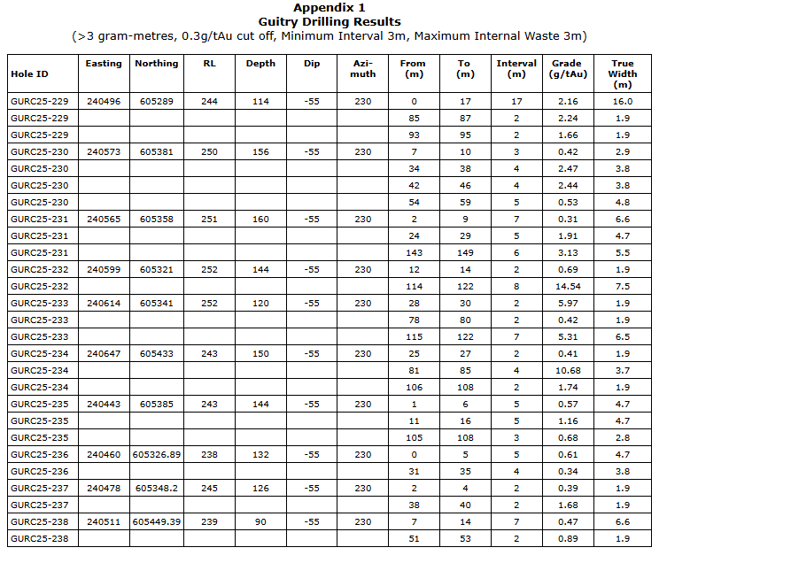 - Drill hole GURC25-234 -- four m at 10.68 g/t Au from 81 m;