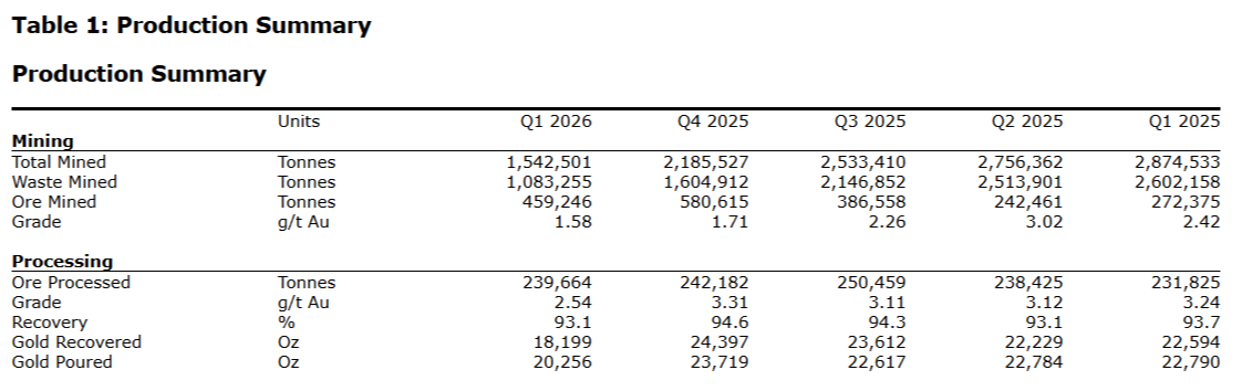 - Full-year 2026 production guidance range maintained at 75,000 to 85,000 ounces of gold;