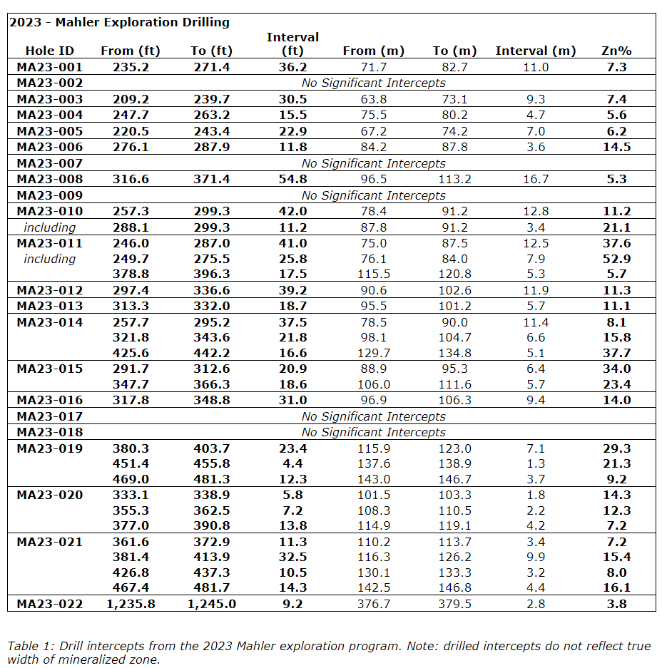 Underground exploration has focused on extending near-mine mineralization along strike from the active Lower Mahler and New Fold orebodies. To date, assays have been returned on 22 holes from the Lower Mahler program. The program has successfully identified high-grade extensions of mineralization that will be included in the company's updated mine plan, and have generated additional exploration targets. MA23-022 has successfully extended mineralization roughly 1,000 feet from the previously known mineralized extent.