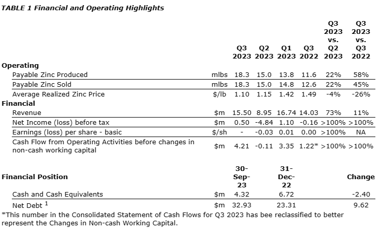 - Tons milled were consistent with milling rates in the prior quarter and payable pounds of zinc produced were 22% higher than the prior quarter