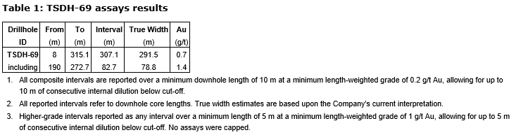 • TSDH-69 intersected 307.1 metres at 0.7 gram per tonne gold from eight metres downhole, including 82.7 m at 1.4 g/t Au from 190 m, including four m at 3.5 g/t Au, and ended in mineralization.
