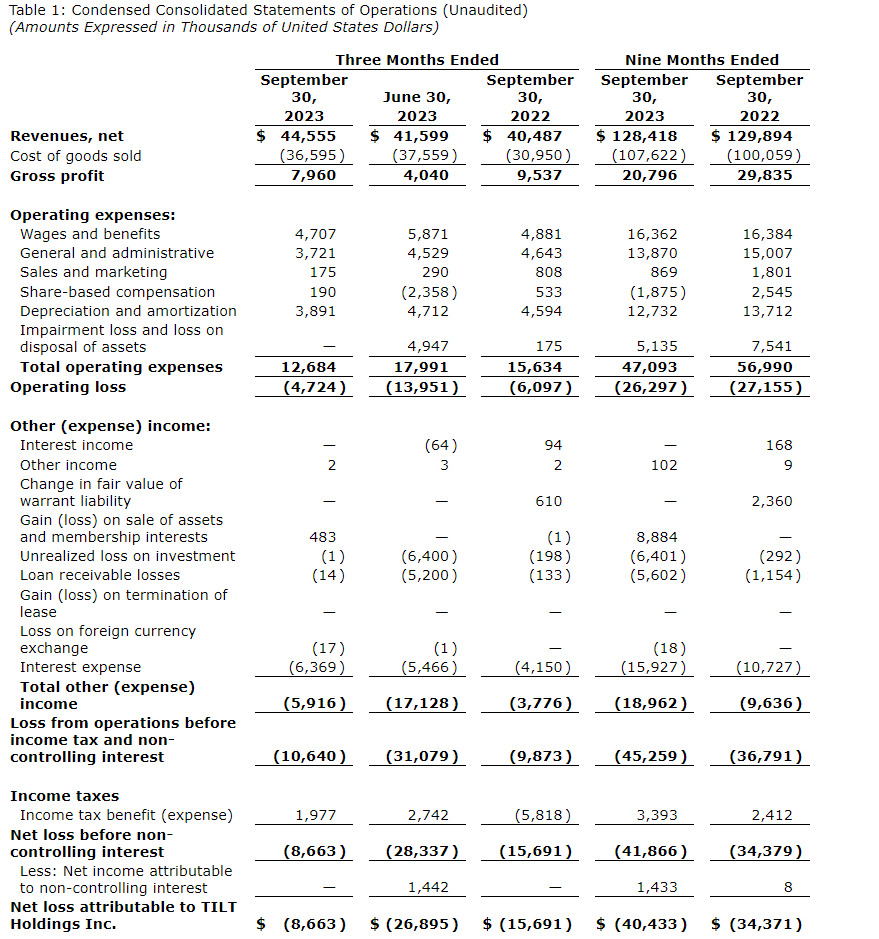 Tilt Holdings Inc. has released its financial and operating results for the three and nine months ended Sept. 30, 2023. All financial information is reported in United States dollars and prepared in accordance with U.S. generally accepted accounting principles (U.S. GAAP) unless otherwise indicated.