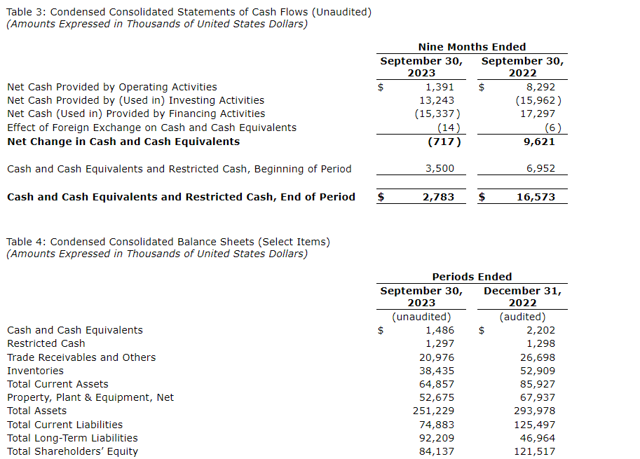 - At Sept. 30, 2023, the company had $2.8-million of cash, cash equivalents and restricted cash compared with $3.5-million at Dec. 31, 2022. Notes payable net of discount at Sept. 30, 2023, was $53.5-million compared with $59.7-million at Dec. 31, 2022.
