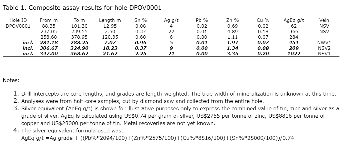 Hole DPOV0001 intercepted 284 grams per tonne silver equivalent (0.60 per cent tin, 1.11 per cent zinc, six grams per tonne silver and 0.07 per cent copper) over 120.35 metres, including 1,022 grams per tonne silver equivalent (2.25 per cent tin, 3.35 per cent zinc, 21 grams per tonne silver and 0.20 per cent copper) over 21.62 metres.