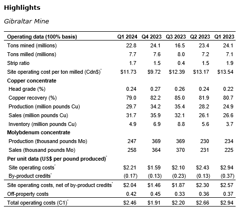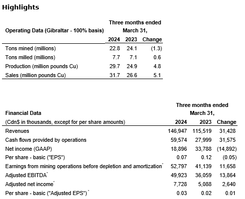 The financial results reported in this news release include the company's 87.5-per-cent proportionate share of Gibraltar mine income and expenses for the period from March 16, 2023, to March 24, 2024 (prior to March 15, 2023 -- 75 per cent), and 100 per cent of Gibraltar mine income and expenses for the period from March 25, 2024, to March 31, 2024.