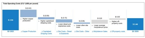 Total operating costs per pound produced (C1)* was $2.46 (U.S.) for the quarter, compared with $2.94 (U.S.) in the prior-year quarter as shown in the attached bridge graph.