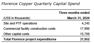 The company has closed several Florence project-level financings to finance initial commercial facility construction costs. On Jan. 26, 2024, the company received the first $10-million (U.S.) deposit from the $50-million (U.S.) copper stream transaction with Mitsui. The remaining amounts will be paid on a quarterly basis. On Feb. 2, 2024, the company also closed a $50-million (U.S.) royalty with Taurus, which was financed in one lump-sum payment at that time.