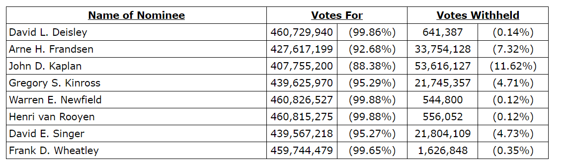 - By a majority of votes cast by the disinterested shareholders, approved the continuation of the shareholder rights plan of the company;