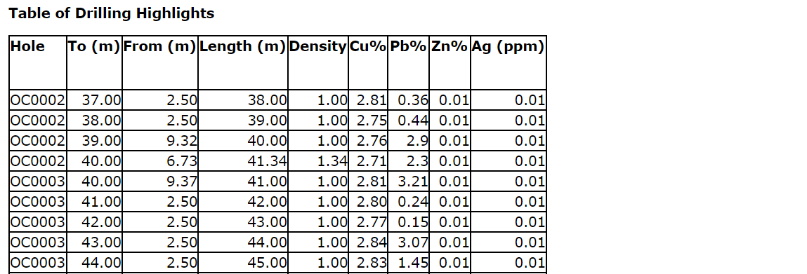 - Hole 3 intersected 10 m of 1.14 per cent Cu from 40 m.