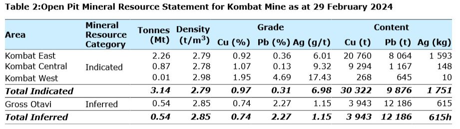 The combined mineral reserves for the Kombat mine are set out in attached table.