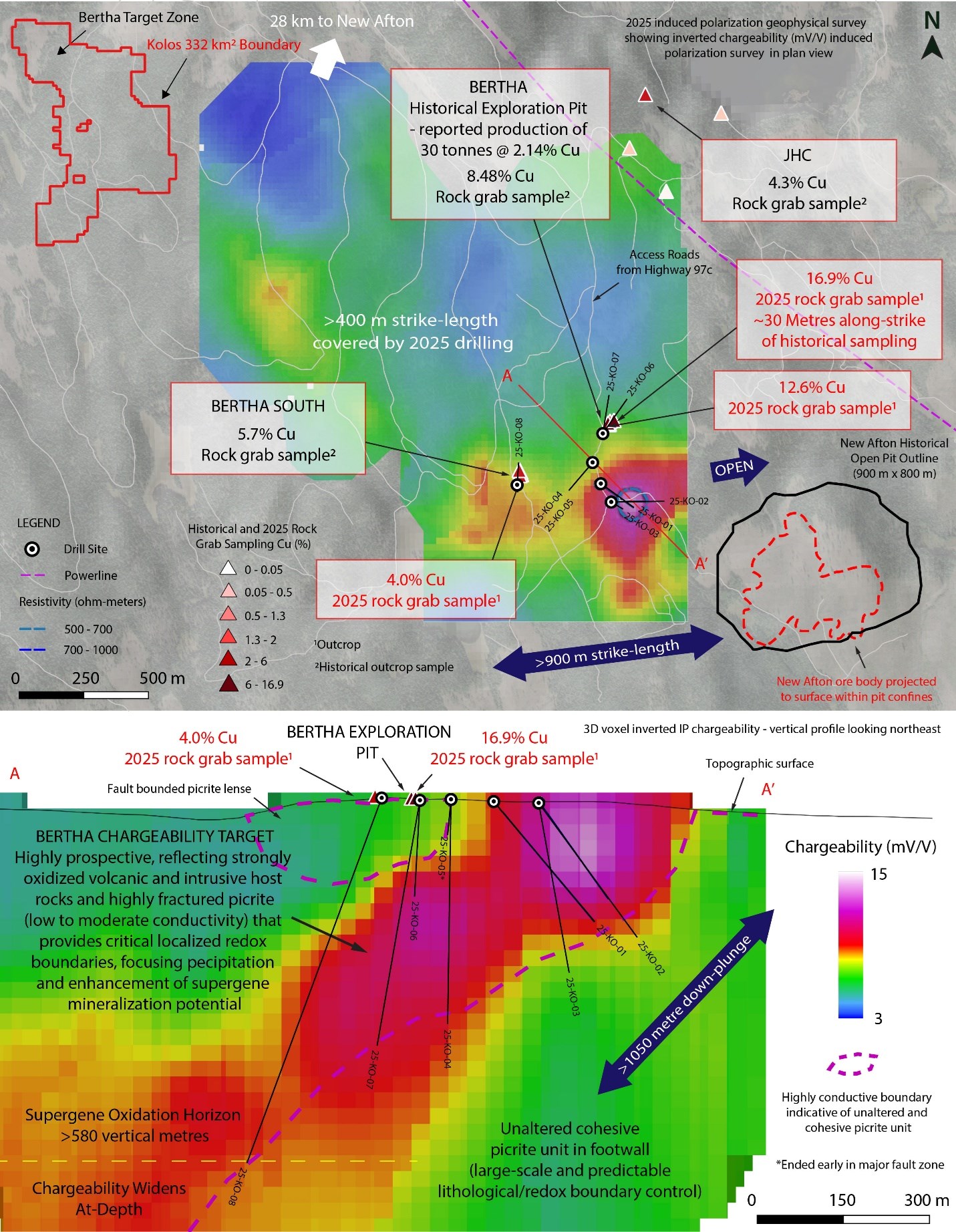 1Note that the information and comparisons disclosed herein to New Afton are not necessarily indicative of mineralization or assay results at the Bertha Zone or elsewhere across the Kolos Project area.