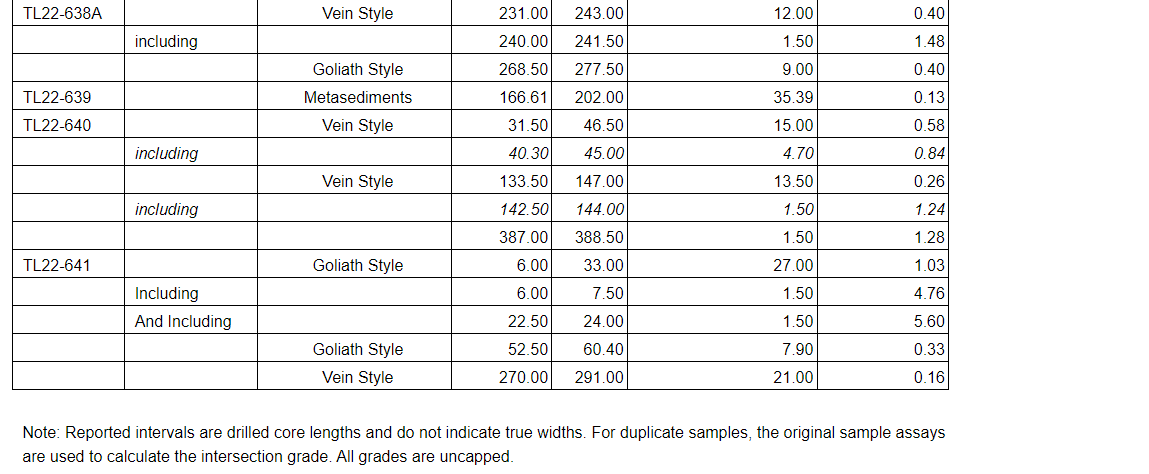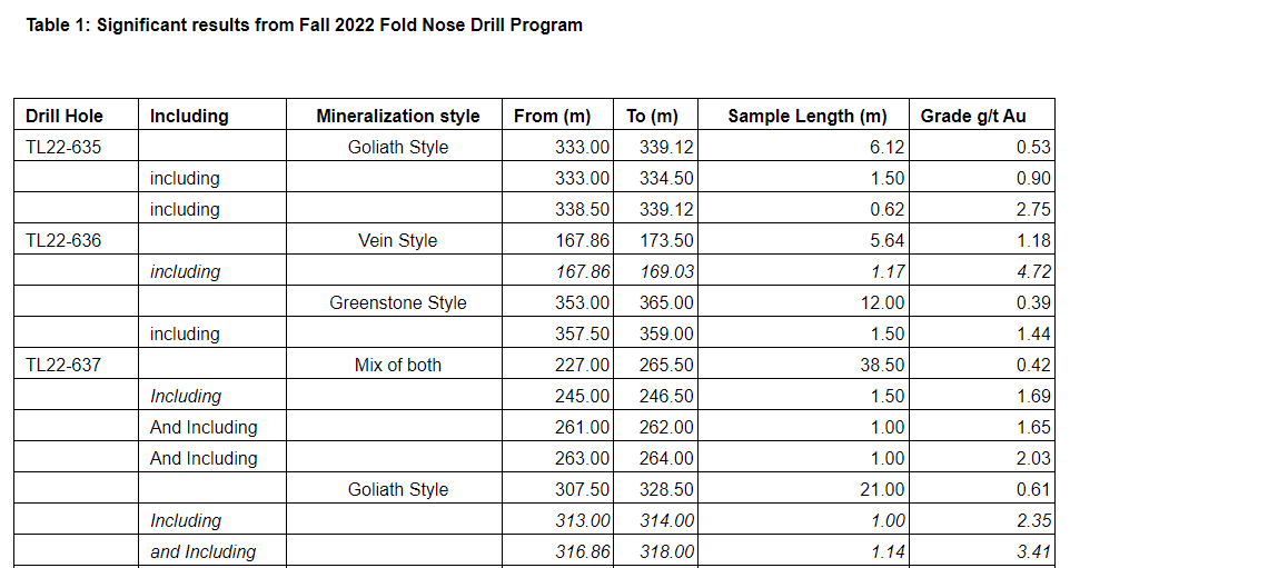 Select targets were drill tested to follow up on data collected from field programs, of which Fold Nose was a top target. Seven holes (2,802 metres) targeted the hinge of Fold Nose, four holes (1,897 metres) tested the east limb area of Fold Nose, and four holes (1,445 metres) tested South Ridge. Significant new results from the drill program came from the Fold Nose hinge, with 27.0 metres grading 1.03 grams per tonne gold, including 1.5 metres at 4.76 g/t Au and 1.5 metres at 5.60 g/t Au, in hole TL22-641 (see an attached table). This result from TL22-641, and those from TL22-637 (which is located in the interior of Fold Nose), is hosted within the same felsic rock unit as the Goliath deposit (see an attached table).