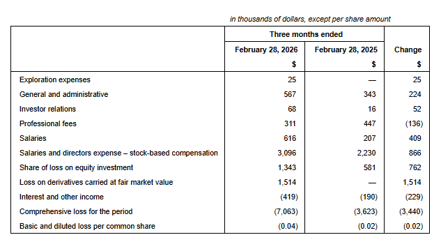 For the three-month period ended Feb. 28, 2026, the company reported a net loss of $7.1-million compared with a net loss of $3.6-million for the three-month period ended Feb. 28, 2025. The increase in net loss is primarily driven by two non-cash items: (i) the mark-to-market fair value adjustment of $1.5-million for the derivative liability related to the company's obligation to issue common shares and warrants to the DOW; and (ii) stock-based compensation charges as a result of the annual grant with higher Black-Scholes values in the current year compared with the prior year. The loss is also impacted by an increase in activity at Ambler Metals, which resulted in a larger amount for the company's share of loss on the equity investment and an increase in personnel costs due to the addition of senior staff.