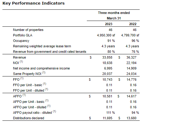 Funds from operations (FFO) and adjusted funds from operations (AFFO) basic and diluted per unit decreased by five cents to 11 cents as compared with Q1 2022.