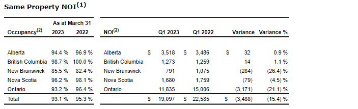Property occupancy in Alberta and British Columbia decreased due to lease expiries in the second half of 2022, however NOI was positively impacted by contractual rent increases. New Brunswick and Nova Scotia same-property NOI experienced a decline due to certain tenants that downsized on renewal, however same-property occupancy in New Brunswick was positively impacted by new lease deals and tenant expansions completed in 2022 with rents commencing in the first half of 2023.