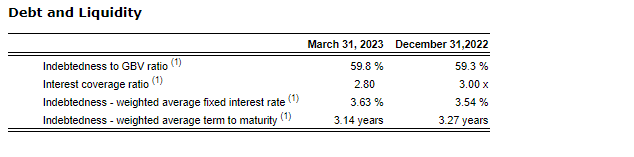 As at March 31, 2023, the REIT's mortgage portfolio carried a weighted average term to maturity of 3.14 years and a weighted average fixed interest rate of 3.63 per cent. During the quarter, the REIT refinanced a total of $31,121 of mortgages, one with a fixed interest rate of 4.83 per cent (five-year term) and one with a variable interest rate at prime plus 1.5 per cent (one-year term), providing the REIT with additional liquidity of approximately $5,700.