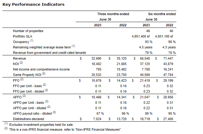 - Commenced a normal course issuer bid that became effective from April 18, 2023, and will remain in place until the earlier of April 17, 2024, or the date on which the REIT has purchased the maximum number of units permitted. During the six months ended June 30, 2023, the REIT repurchased 124,900 units for $300,000 under the NCIB.