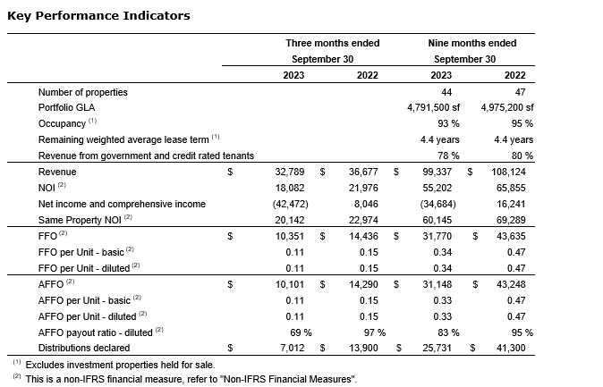 Certain terms used in this news release, such as FFO, AFFO, FFO and AFFO payout ratios, NOI, same-property NOI, indebtedness, gross book value (GBV), indebtedness to GBV ratio, net earnings before interest, tax, depreciation and amortization, and fair value gain (loss) on financial instruments and investment properties (adjusted EBITDA), interest coverage ratio, net asset value (NAV) per unit, total equity, and available funds, are not measures defined by IFRS as prescribed by the International Accounting Standards Board, do not have standardized meanings prescribed by IFRS, and should not be compared with or construed as alternatives to profit/loss, cash flow from operating activities or other measures of financial performance calculated in accordance with IFRS. FFO, AFFO, FFO and AFFO payout ratios, NOI, same-property NOI, indebtedness, GBV, indebtedness to GBV ratio, adjusted EBITDA, interest coverage ratio, adjusted cash provided by operating activities, NAV per unit, total equity, and available funds as computed by the REIT may not be comparable with similar measures presented by other issuers. The REIT uses these measures to better assess the REIT's underlying performance and provides these additional measures so that investors may do the same. Details on non-IFRS measures are set out in the REIT's management's discussion and analysis (MD&A) for the three and nine months ended Sept. 30, 2023, and the annual information form (AIF), which are available on the REIT's profile on SEDAR+.